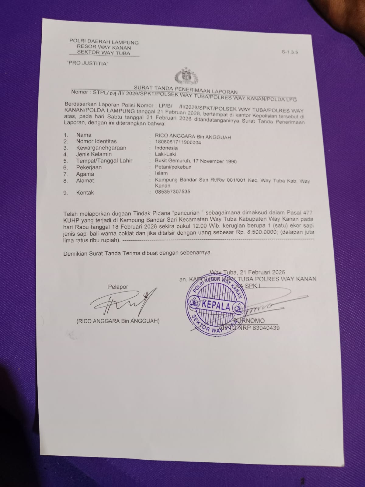 Sebelumnya, Rico ( Ketua PWI Way Kanan red ) juga mendapatkan musibah, dimana seekor sapi miliknya juga raib di gondol pencuri